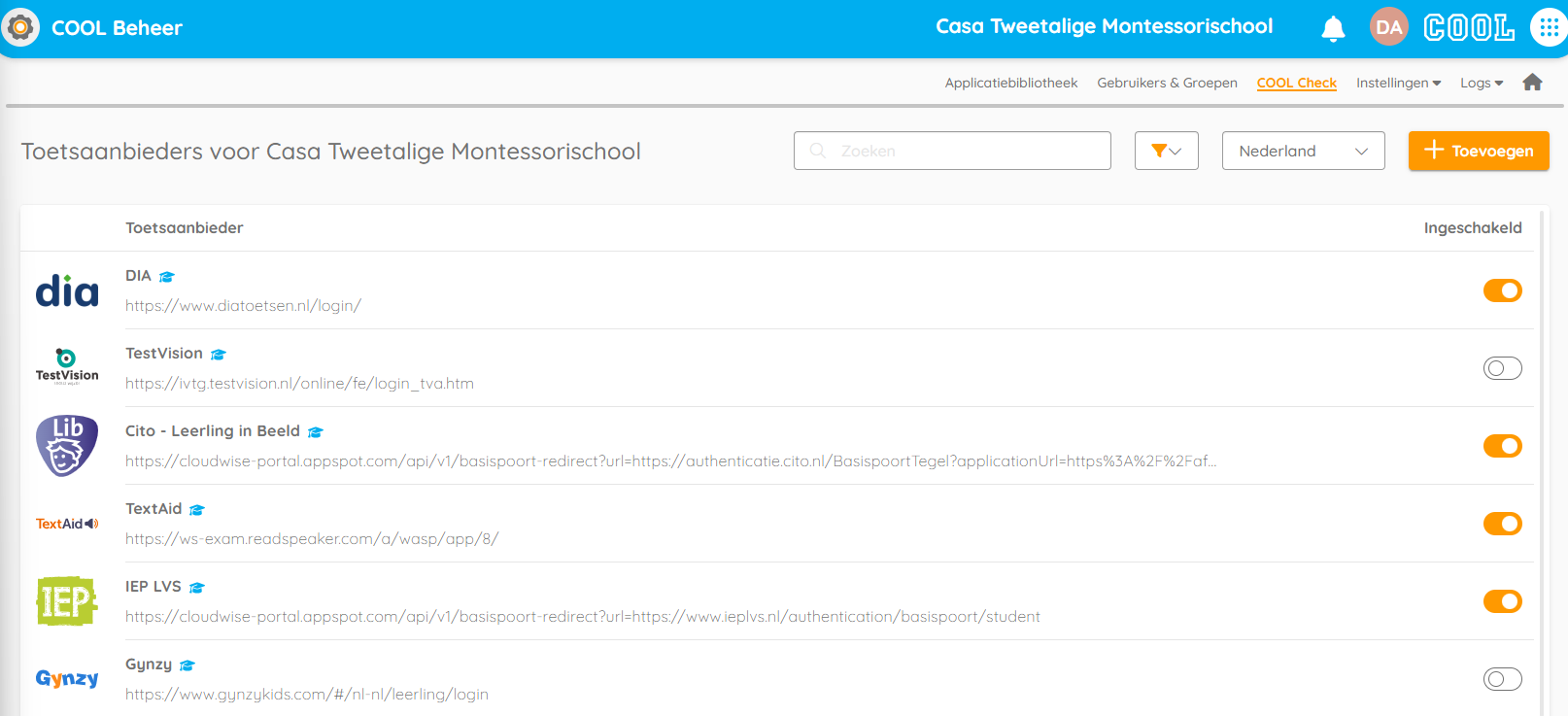 - Je ziet nu alle toetsaanbieders waarmee COOL Check gekoppeld kan worden.